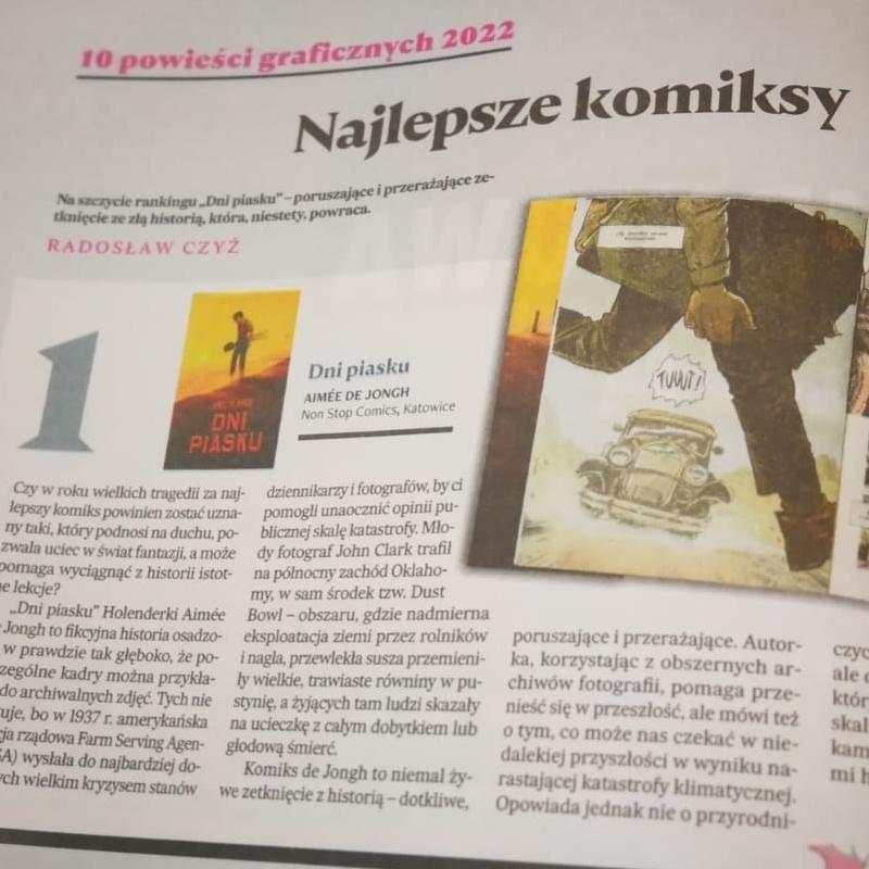 Miło nam poinformować, że album "Dni piasku" Aimée de Jongh, otrzymał miano najlepszego komiksu 2022 r., wg redakcji czasopisma Książki. Magazyn do czytania. W zestawieniu, na miejscu dziewiątym, znalazł się również album "Nocny krzyk" Borji Gonzaleza. Dziękujemy!